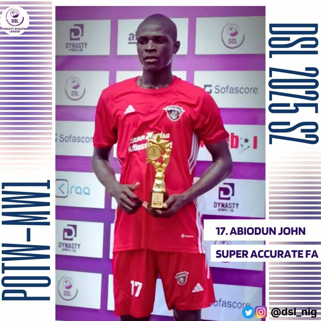 With well-taken goals in his team’s match against Immaculate FC, Abiodun John (17) of Super Accurate FA is the DSL Player of the Week (POTW) for Match Week 1.
